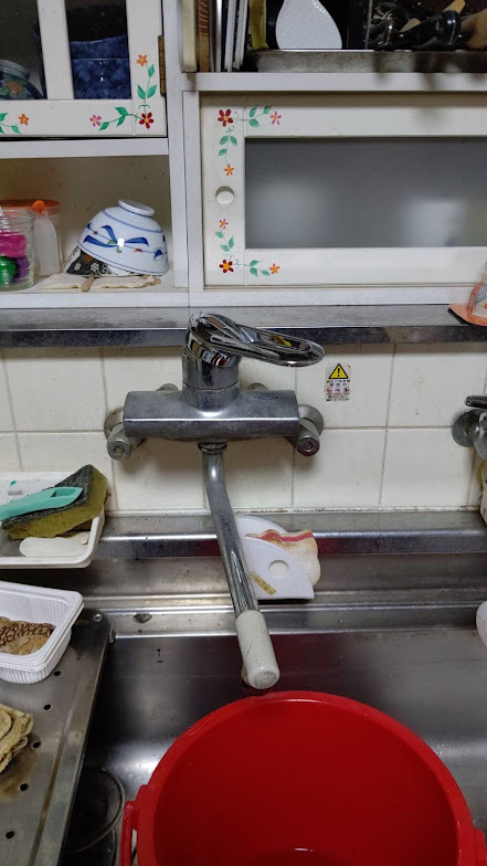 ここまで古いと取り外しにかなり気を使いますね。古いものほど水道管との接続部が強く固着してしているので、取り外そうとすると水道管に負担が掛かり折れてしまわないかとひやひやです。かなり慎重に作業することが必要です。給水栓の錆なども気になるところですね。