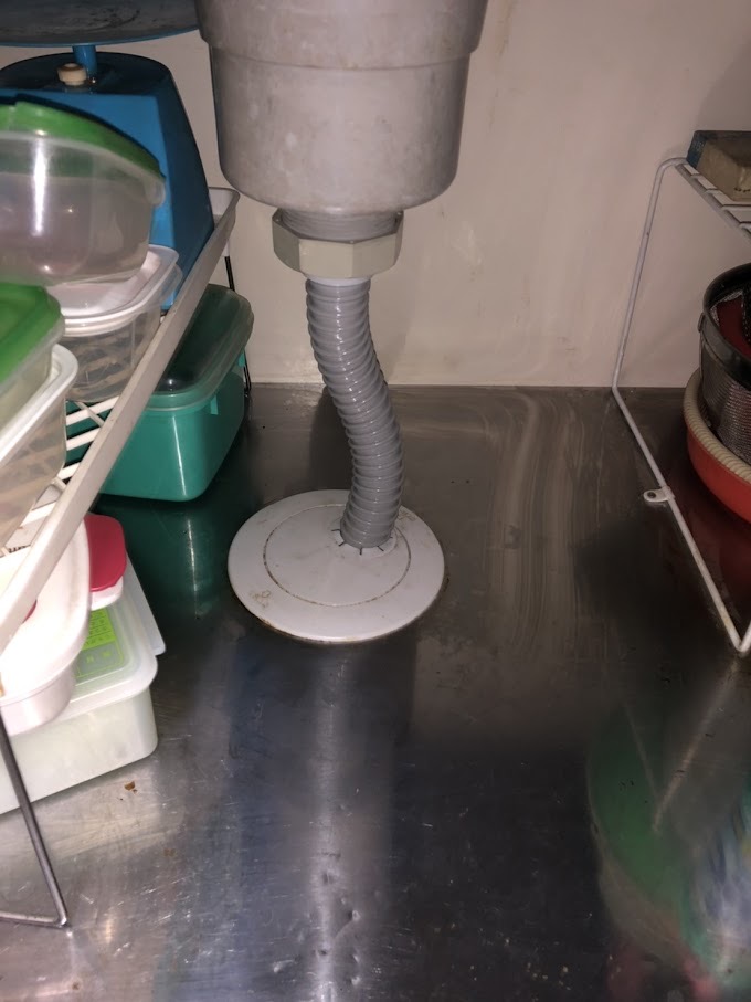 まずはいつも通りキッチン下の排水管を確認しましたが、排水が溢れている事はなく、排水テストをしてみると溜まってゆっくり流れていく感じです。 お客様に状況を聞いてみると「最近になって流れににくいことがあった」との事です。