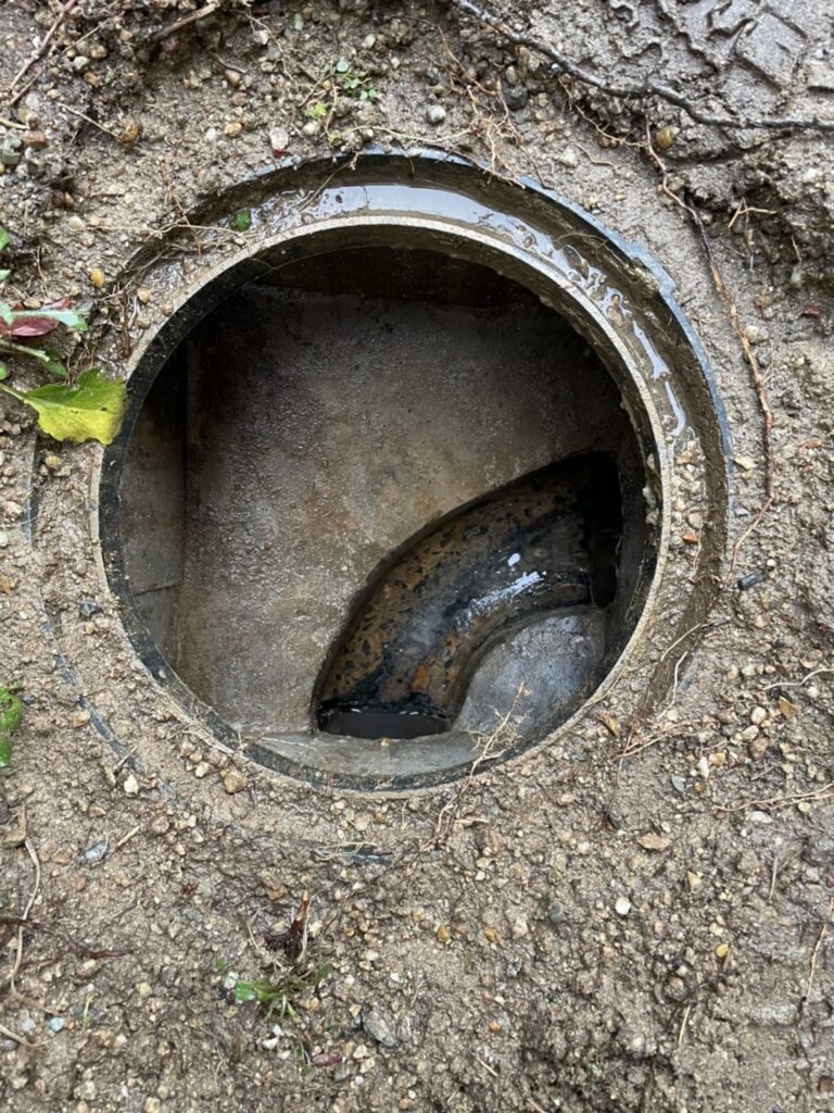 お客様が「これはやっぱり詰まっている状態なんですか?」とのご質問なんですが、しっかり詰まっていますね。通常、汚水桝には水もない状態が正常になります。さてどこで詰まりを起こしているんでしょうか? 下流側の排水マスを確認していきます。